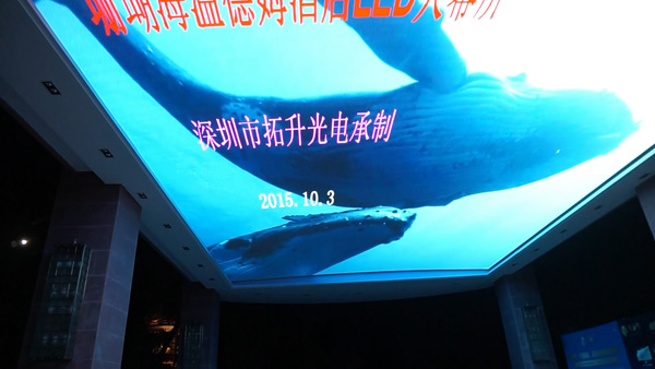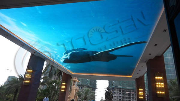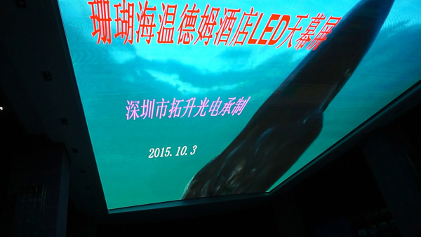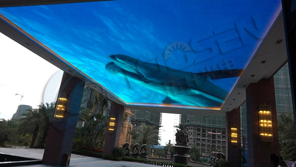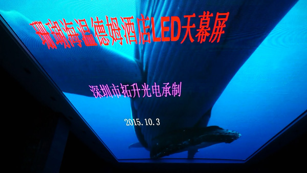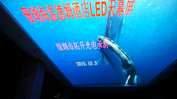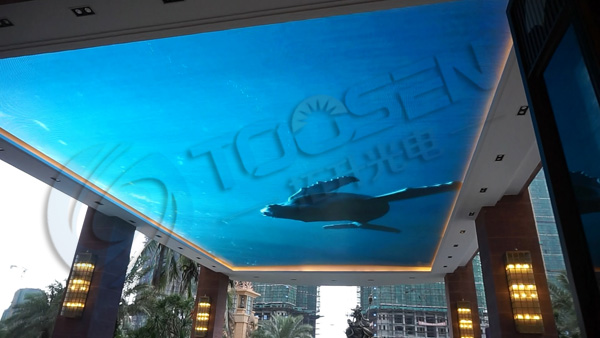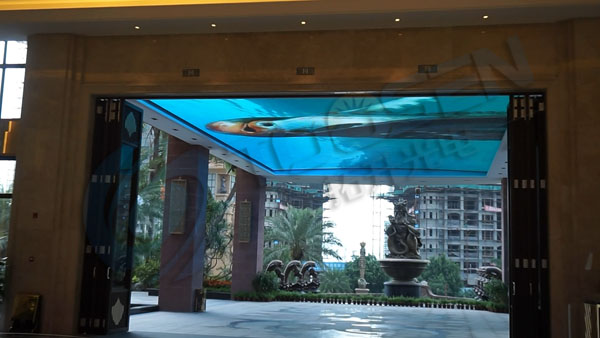 客戶酒店以海洋元素為主,那么自然也少不了高清全彩LED顯示屏的身影。拓升光電為酒店專業(yè)定做的高清天幕LED顯示屏,安裝于酒店大廳入口屋頂,采用高清LED天幕顯示屏播放海洋世界視頻,讓顧客好像走進了海底世界一般,徹底讓酒店的海洋元素更加突出了。天幕LED顯示屏的助力會讓酒店的生意越來越紅火!