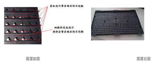 方法二:最簡(jiǎn)單的面罩前后面設(shè)計(jì)同樣的突起,也就是說(shuō),模組面罩的前面設(shè)計(jì)什么樣的光學(xué)突起,后面在同樣的位置就設(shè)計(jì)什么樣的突起,這樣使面罩前后的縮水達(dá)到平衡,從而使面罩前面和后面因?yàn)榭s水而產(chǎn)生的應(yīng)力得到平衡,面罩的變形就迎刃而解。